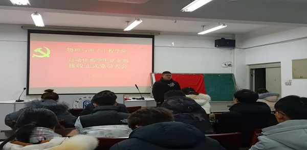 2020年12月31日下午,物电学院自动化系学生党支部在躬行C楼505召开支部大会,讨论接收缪长清等4名同志预备党员转正问题,自动化系学生党支部全体党员及积极分子参加会议,会议由自动化系学生党支部委员于雪峰同志主持。