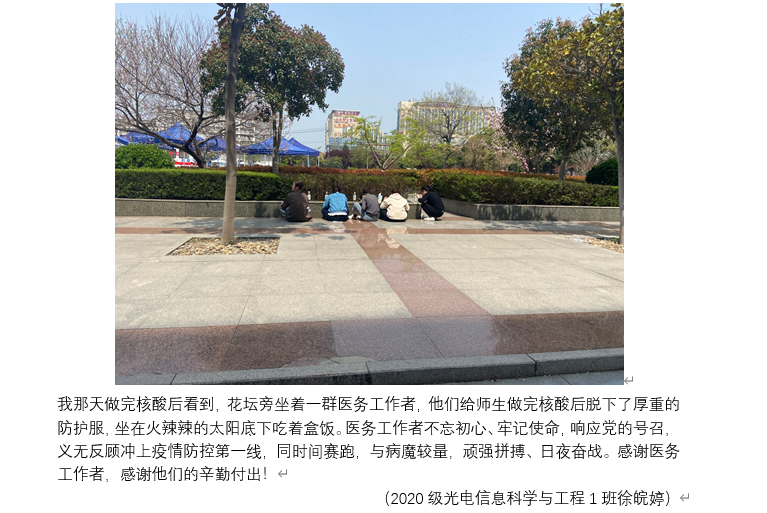 “花坛旁坐着一群医务工作者,他们给师生做完核酸后脱下了厚重的防护服,坐在火辣辣的太阳底下吃着盒饭……感谢医务工作者,感谢他们的辛勤付出!”这是此次征集活动获奖作品中的一段话。此作品的作者2020级光电信息科学与工程1班徐皖婷说:“疫情就是命令,白衣就是战袍,医生护士就是战士。没有人生来就是英雄,总有人用平凡成就伟大,致敬迎难而上的白衣天使。我作为自动化系学生党支部的一名入党积极分子,应该学习他们对党、对人民高度负责的崇高精神,致敬他们始终把人民生命安全和身体健康放在首位的坚定信念。”一张张照片将暖心之举定格,一笔一画满是学生们对防疫工作者的尊重和感谢。