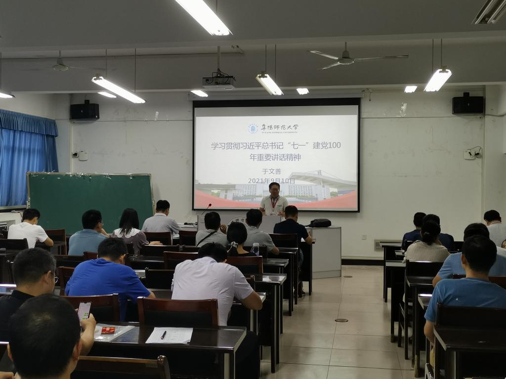 根据学校统一部署安排,9月17日下午,物理与电子工程学院党委在躬行C楼505大教室举行了学习贯彻习近平总书记“七一”重要讲话精神宣讲报告会,学校党委理论宣讲团成员、马克思主义学院于文善教授作《深入学习贯彻习近平总书记“七一”重要讲话精神》专题宣讲报告。报告会由物理与电子工程学院党委书记吴学军主持,学院全体教职工及部分学生党员聆听了宣讲报告。
