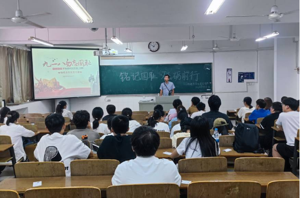 李军首先带领同学们观看了“九一八”事变后日本侵略军在中国大地上实施残忍暴行的影视资料。随后,李军以《勿忘国耻 砥砺前行》为主题从事件背景、事件经过、历史影响、抗战忠魂、警钟长鸣等方面向同学们详细介绍了“九一八”事变的整个过程,回顾其带来的沉痛教训。他说,九一八事变是日本侵华战争的开端,对中国和世界产生了深远的影响,为中华民族带来了不可磨灭的灾难,大家要永远牢记落后就要挨打的沉痛教训,肩负起祖国繁荣复兴的历史重任,戮力同心、团结奋斗,勿忘国耻、砥砺前行,为实现中华民族伟大复兴贡献力量。同学们全程表情严肃、观看认真,不时拿出笔记默默记录。