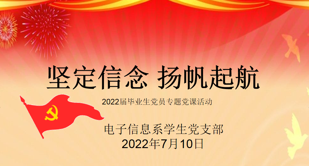 为提醒毕业生党员时刻铭记自己的党员身份,自觉践行初心使命,筑牢信念之魂,在今后的学习生活工作中更好地发挥党员先锋模范作用,2022年7月10日,我院电子信息系学生党支部以线上的方式举行“喜迎二十大,青春正当时”教育实践活动之“坚定信念·扬帆远航”——毕业生党员专题党课活动。电子信息系学生党支部的所有毕业生党员参加,活动由党支部书记陶清主持。
