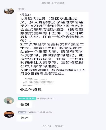 为深入学习贯彻习近平新时代中国特色社会主义思想,2022年6月-7月,支部依托“学习通”线上学习平台开展专题学习培训,组织学生党员、入党积极分子学习习近平新时代中国特色社会主义思想,本次专题学习活动历时两个月,所有同学认真学习,并做好学习笔记,支部定期统计和公布大家的学习进度。用习近平新时代中国特色社会主义思想武装大脑,指导实践,让当代中国马克思主义、21世纪马克思主义放射出更加灿烂的真理光芒。