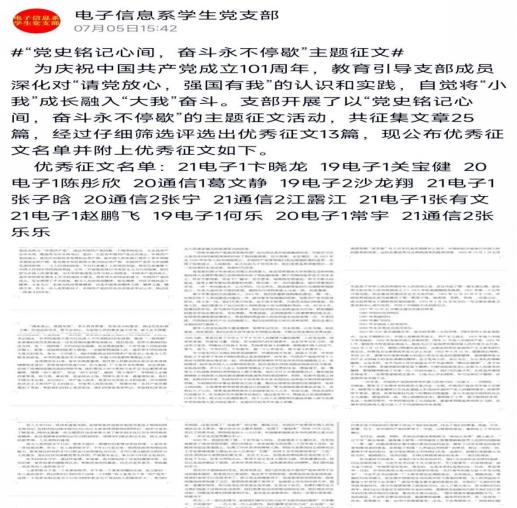为庆祝中国共产党成立101周年,教育引导支部成员深化对“请党放心,强国有我”的认识和实践,自觉将“小我”成长融入“大我”奋斗。电子信息系学生党支部6月27日-7月3日开展了以“党史铭记心间,奋斗永不停歇”庆“七一”征文活动。通过本次活动,广大党员、入党积极分子进一步激发了学习党史的热情,进一步提高了政治思想觉悟,进一步坚定了矢志不渝跟党走的信念。