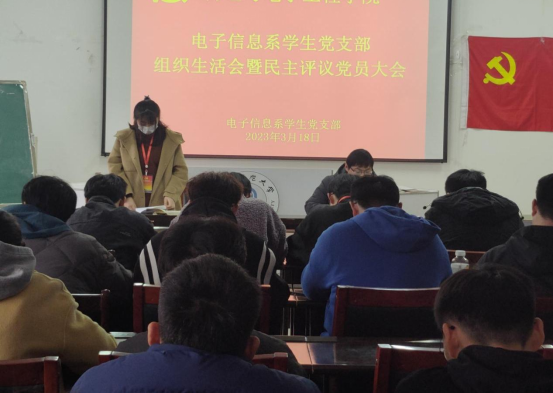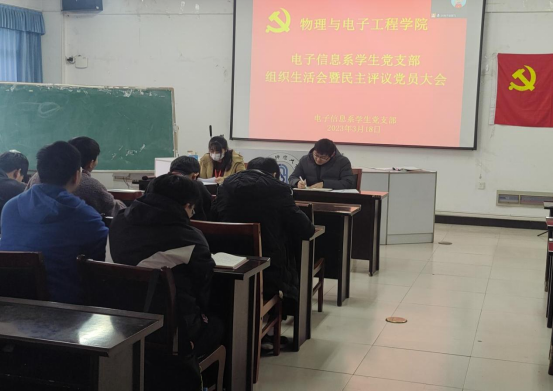 为学习贯彻党的二十大精神,提高党员的党性修养和思想觉悟,推进全面从严治党,2023年3月18日下午,电子信息系学生党支部在躬行C楼505开展了2022年度组织生活会暨民主评议党员活动。会议通过线上线下相结合的形式进行,参加会议的有正式党员20人、预备党员20人,列席人员8人。大会由支部书记陶清主持。