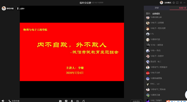 为加强学生诚信教育,维护考场公平公正, 2018级电气工程及其自动化专业、电子科学与技术专业、通信工程专业以及光电信息科学与技术专业于7月5日,在线上开展了“内不自欺,外不欺人”诚信考试教育主题班会。本次会议由辅导员辛敏主持。