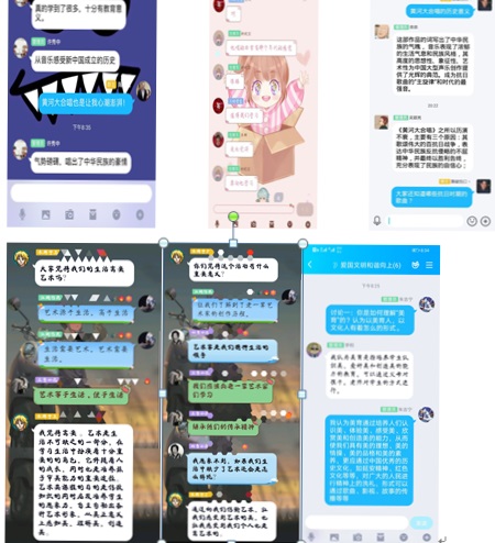 在观看完“美育云端课堂”开幕式后,各寝室利用线上QQ群进行了热烈讨论,从“‘美育云端课堂’活动的意义”、“对于‘黄河大合唱’此类红色歌曲的了解”等等,纷纷发表出自己的看法,同学们都认为此次活动意义深远,通过音乐及背后的故事,给予我们深刻的爱国主义教育,了解到了我们的先辈在如此艰辛的环境下进行创作,将那不屈不挠、奋勇向上的精神赋予到作品之中,并感染一代代中华儿女为之从救亡图存到为实现中华民族的伟大复兴而不懈奋斗。