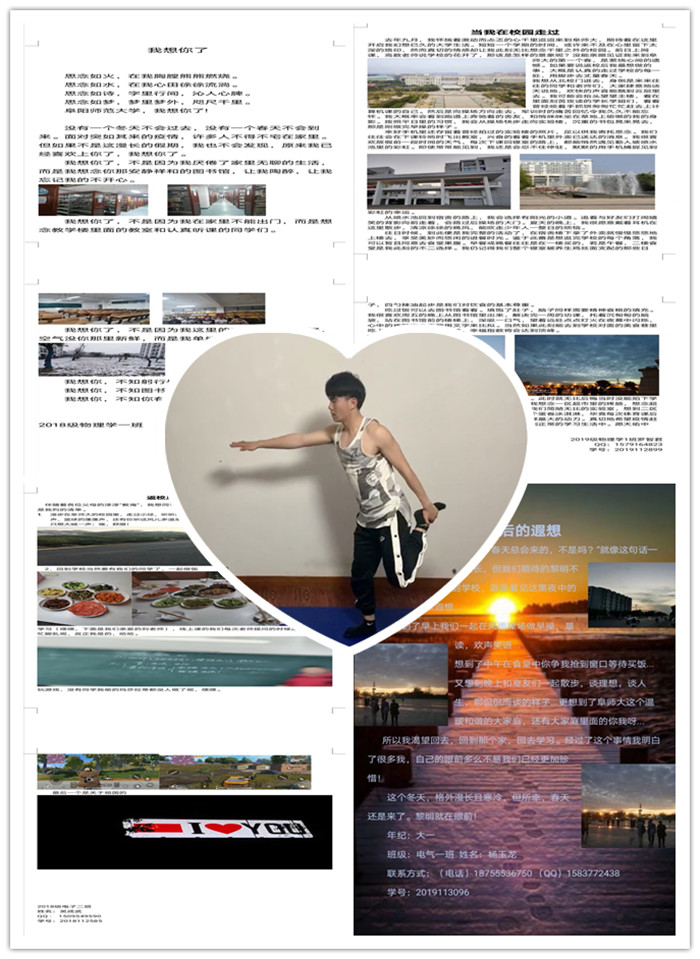 为丰富我院学生的日常生活,缓解疫情防控期间易出现的烦躁情绪,关爱学生心理与身体健康,我院开展了健身打卡、绘制手抄报、文化与生活大赛、抗疫忆校园等线上系列活动。在以线上教学为主导的关键时期,物电学子们用实际行动展现出了大学生居家学习生活的别样风采。