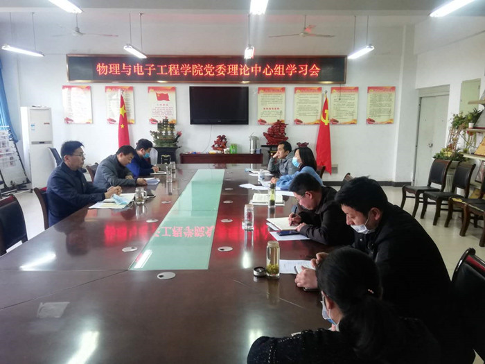 2020年4月13日下午,我院党委理论中心组举行集体学习会,院党委书记吴学军、副院长朱勇(主持工作)、党委副书记田志坚以及党委委员、全体党支部书记和部分辅导员参加,会议由吴学军主持。