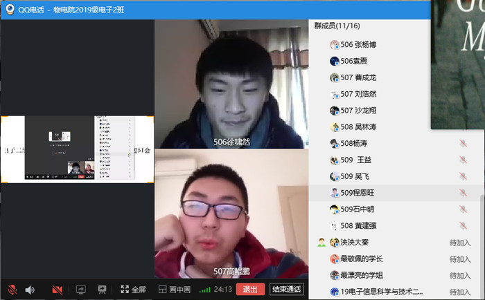 为了增强同学们的爱国意识,全面了解疫情防控期间学生思想动态,3月11号下午,2019级电子信息科学与技术2班召开了线上爱国主义主题班会,会议由班长徐啸然主持,全班40名同学与辅导员李聪共同参加。
