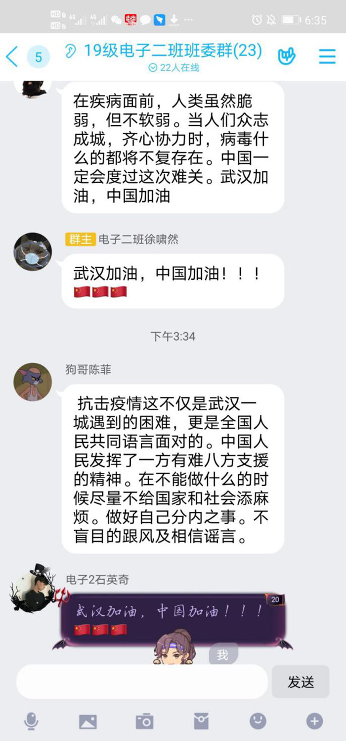 班长就最近的疫情防控展开话题,鼓励大家谈一谈对这次疫情的看法与感想,同学们都积极踊跃的发言。团支书表达了自己对以钟南山院士为代表的医护人员的爱国行为的赞赏,文艺委员就如今的各站点防控措施表达了自己的看法,组织委员就生活中的很多小事体现出的爱国情怀侃侃而谈,还有很多同学也相继发言,大家在讨论过程中交流想法,相互学习。在班会中,同学们纷纷表示在这场病毒的战役中,更应该提高防范意识,主动担当起新时代的责任和使命。最后,李聪进行总结发言,表示当代大学生不仅仅要增强爱国意识与民族凝聚力,也应该注重培养自身的专业能力,努力成为真正对国家有奉献的栋梁之才。