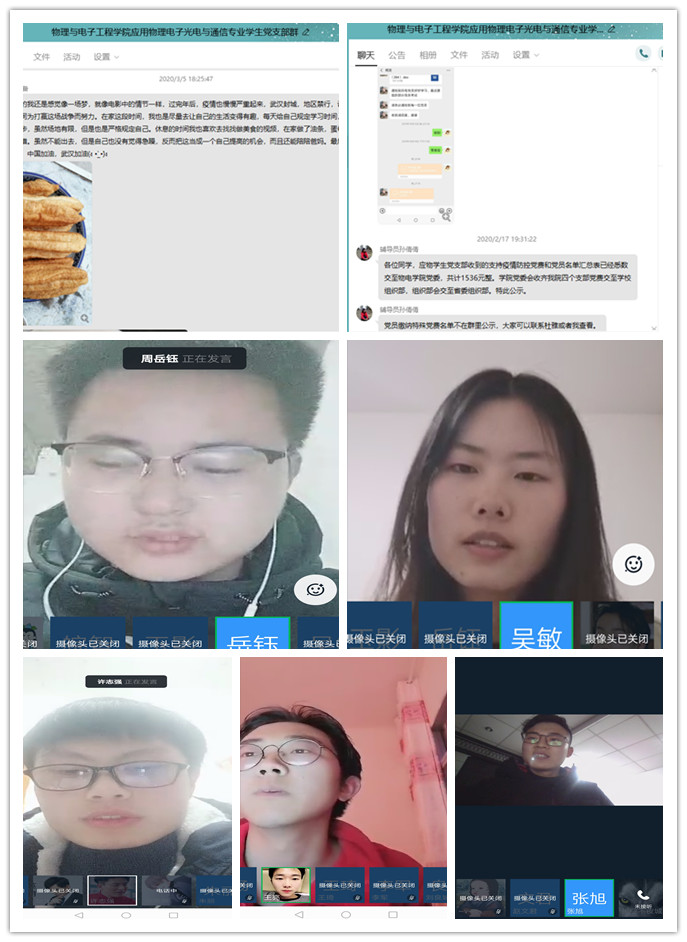 为贯彻落实阜阳师范大学《关于在新冠肺炎疫情防控期间严肃党的组织生活的通知》精神,严格落实“三会一课”制度,物电学院应用物理电子光电与通信专业学生党支部于3月11日在钉钉群发起支部视频会议,开展了以“践行初心使命坚决战胜疫情”为主题的党日活动。支部全体党员和部分入党积极分子参加会议。