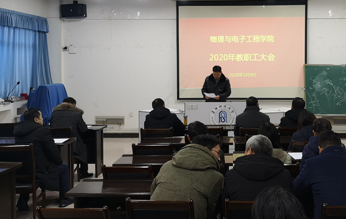 伴随着国歌的响起,我院2020年教职工大会正式拉开了序幕。首先是李季院长代表学院作题为《面对新要求、抓住新机遇,齐心协力推进物电学院跨入新境界!》的院长工作报告,报告回顾总结了我院2019年在多个方面取得的成就,依据学校更名大学后面临的新形势、新目标、新要求,提出了我院2020年的工作目标和指导思想。接着,朱勇介绍《物理与电子工程学院绩效分配方案(修订稿)》,吴韬代表学院分工会作了2019年度学院分工会工作总结报告,从师德师风建设、教职工权益维护及文体活动开展情况等方面总结了2019年度物理与电子工程学院分工会所做的工作。随后,全体教职工分6个小组对《院长工作报告》、《物理与电子工程学院院绩效分配方案(修订稿)》等进行了热烈地讨论。各小组讨论后,主席团会议对讨论结果进行梳理和总结,形成初步意见。经全体成员举手表决,全票通过院长工作报告,原则通过《物理与电子工程学院绩效分配方案(修订稿)》。最后,马健书记为此次会议做总结讲话,就贯彻落实大会精神提出两点意见,一要认真总结教代会经验,进一步建立健全规章制度,规范工作程序,完善监督机制,畅通信息交流渠道,使我院民主管理工作制度化、规范化和程序化。二要不断提高自身素质和参与民主管理的能力。并希望大家不忘初心、牢记使命,撸起袖子加油干,努力开创物理与电子工程学院更加美好的明天,为学校建设地方性应用型高水平师范大学做出更多更大的贡献!