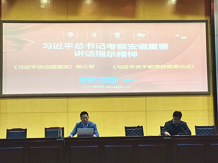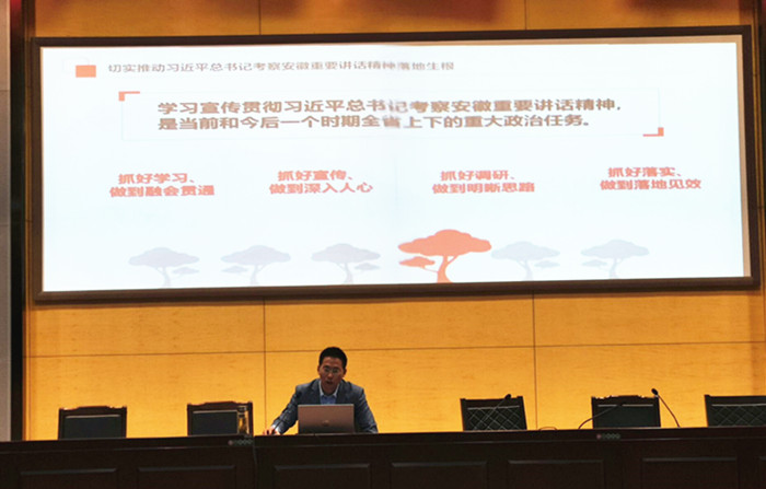 刘张飞和大家一起回顾了习近平总书记在安徽考察的行程,指出了总书记考察安徽的重大意义。从六个方面全面介绍了在习近平总书记2016年视察安徽重要讲话指引下我省推进美好安徽建设取得的新成就,全面阐述了习近平总书记这次考察安徽重要讲话指示精神的科学内涵,并从12个方面明确了如何贯彻总书记重要讲话指示精神。随后刘张飞还就《习近平谈治国理政》第三卷、习近平总书记关于教育的重要论述以及省委十届十一次全会精神等内容进行了宣讲。