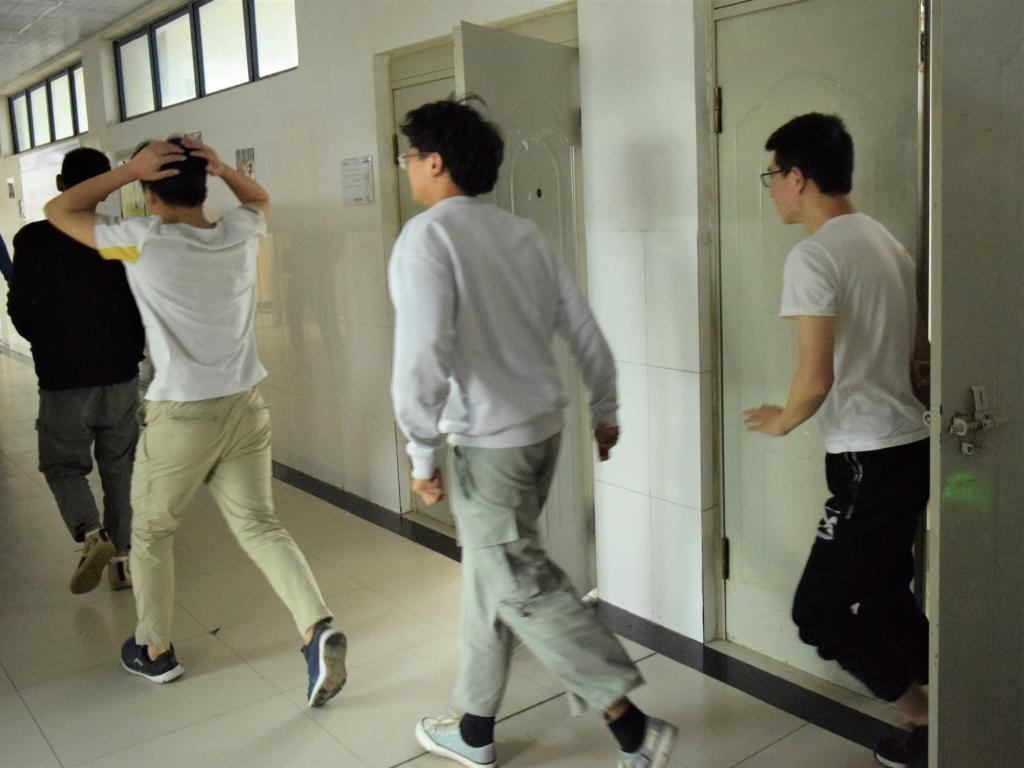 5月12日下午,我院组织学生在教室、办公楼以及寝室等学生经常出入的地方进行了地震逃生演练。演练前,李卉、邵贤志同学为参与逃生演练的同学进行培训。随着警报声响起,所有同学迅速行动起来。演练结束后,李卉又根据演练情况进行总结,鼓励大家平时掌握好逃生知识,做到临危不乱。