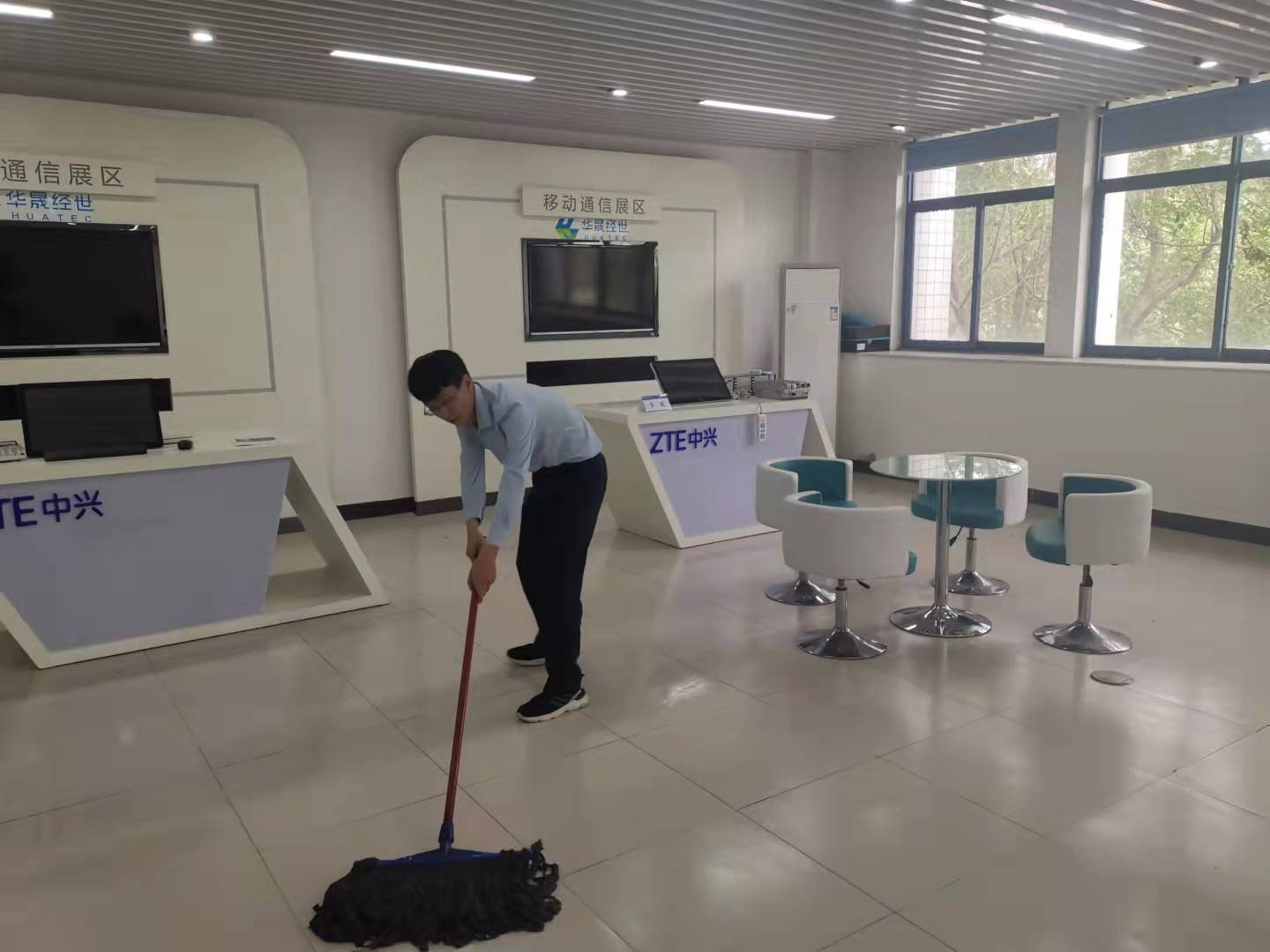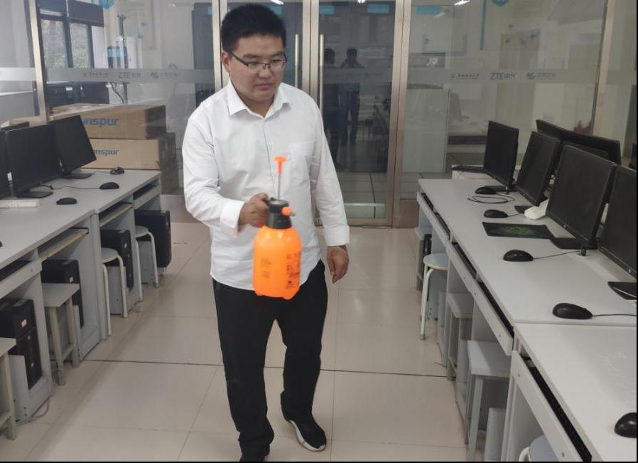 驻校工程师首先对基地展厅、机房、设备进行了全面打扫,整个基地焕然一新。随后,按照学校疫情防控要求,对基地机房、实训室进行了全面消杀,为即将返校的学生创造一个干净、安全的学习环境。