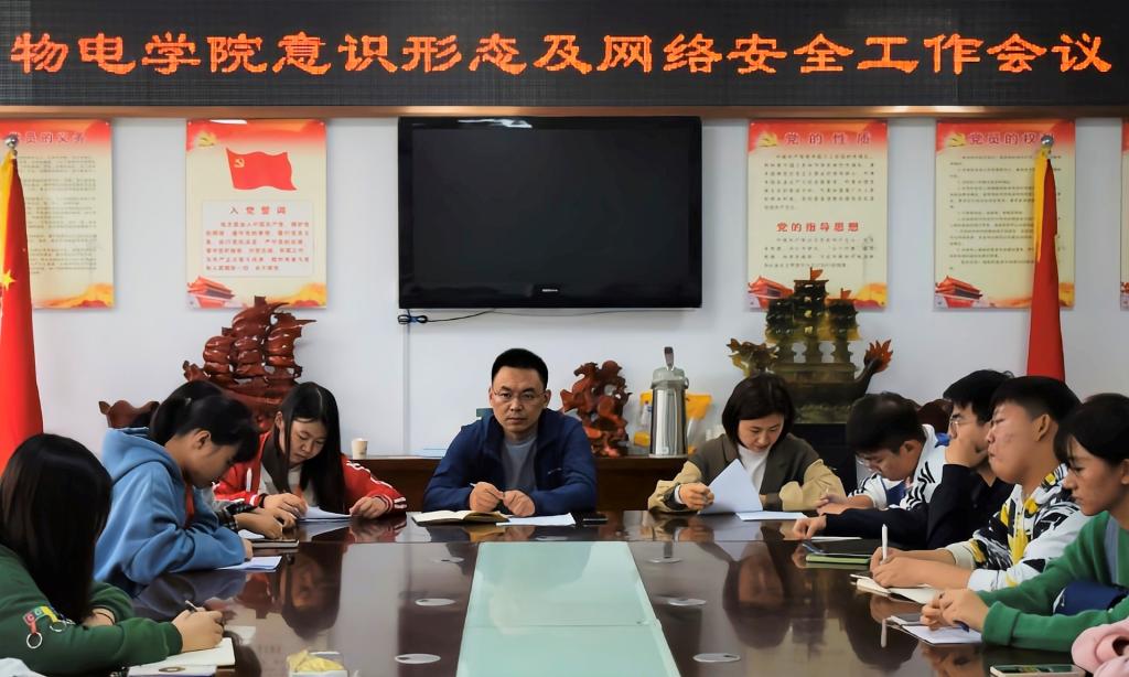 为提高学生的网络安全意识,加强对学生的思想引导工作,11月4日中午,物理与电子工程学院在躬行C楼306会议室召开意识形态与网络安全工作会议。学院党委副书记张传智、团委书记辛敏出席本次会议,各班宣传委员及学院新媒体工作室负责人共同参会讨论。会议由辛敏主持。