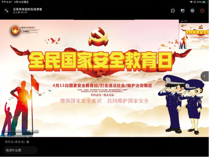 为大力宣传国家安全相关知识,切实提高广大团员青年国家安全意识,物理与电子工程学院团委于4月15日晚通过钉钉开展线上“4.15”全民国家安全教育日专题学习活动。参加此次会议的有学院团委书记辛敏,兼职团委副书记石英奇,2019级、2020级和2021级团支部书记、副书记。会议由石英奇主持。