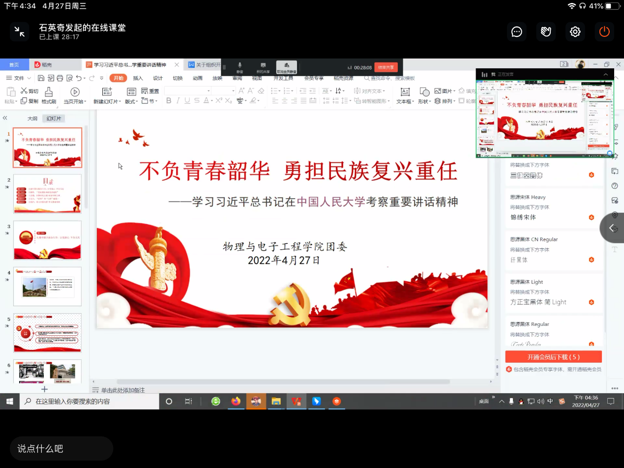 为深入学习贯彻习近平总书记考察中国人民大学时的重要讲话精神,推动大学生讲思政课活动有序进行,4月27日下午,我院团委通过钉钉开展线上“学习习近平总书记考察中国人民大学重要讲话精神”专题学习会。我院团委书记辛敏、兼职团委副书记石英奇、2020级和2021级各班团支部组织委员和宣传委员参加学习会,会议由石英奇主持。