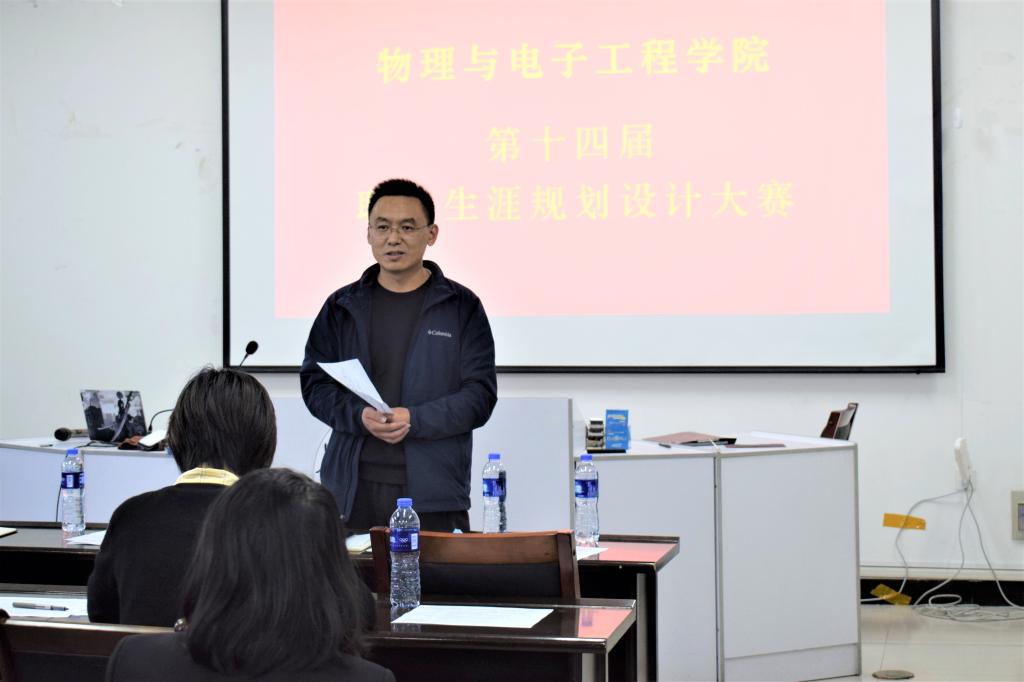 为引导学生树立正确的成才观和就业观,强化职业规划意识和创业意识,物理与电子工程学院于5月14日下午在躬行C楼505教室举办第十四届职业规划设计大赛院级选拔赛。学院党委副书记张传智,辅导员邵丽丽、吴慧梓、李军、辛敏担任本次比赛评委。