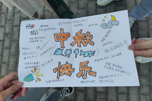 全班齐发力,纸短见长情。9月10日下午,同学们在各寝室进行祝福收集,将对老师的祝福语书写在A4纸上,同时用彩色画笔在周围作画装扮,形成简约而又见真情的贺卡。随后一些学生代表到办公室把贺卡送给辅导员老师,并当面口头表达了对老师的感恩之情。辅导员对班级同学送去的祝福表示感谢,并祝福同学们拥有一个愉快充实的假期。同学们用手工书写最简单的祝福,表达了对老师最深沉长久的情谊。