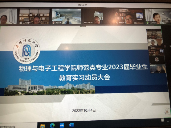 为做好我院2019级师范生教育实习工作,加强师生之间的沟通交流,保障实习工作顺利开展,物理与电子学院于10月4日下午4:30召开线上实习动员大会,学院党委书记吴学军、院长朱勇、实习指导教师及19级物理学和科学教育专业全体学生参加。会议由学院副院长何娟主持。