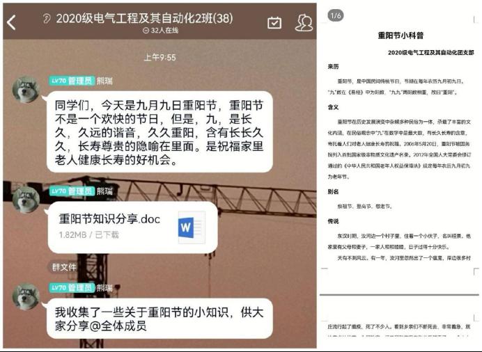 2020级电气2班团支部通过整理分享重阳节的来历、含义、别名、传说和习俗等方面内容,让同学们了解到重阳佳节在历史发展演变中杂糅多种民俗为一体,承载了丰富的文化内涵。其他支部同学通过给分别以长辈打视频、发信息、写书信等形式宣传“敬老”“爱老”这一中华传统美德,用实际行动向长辈们呈上最诚挚的慰问与祝福。