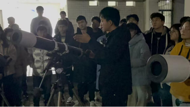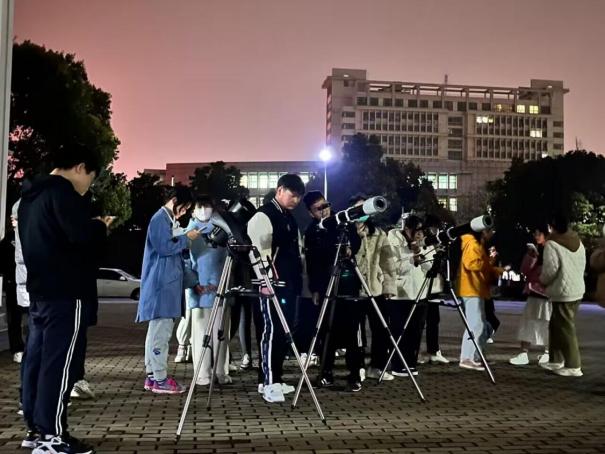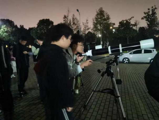 晚上7时许,夜幕降临,活动正式拉开帷幕。躬行C楼东侧广场,三台天文望远镜已放置最佳观测位置。近期天气多变,为了保证观测的清晰,社团工作人员不断地调试方位,寻找最佳观测方位,以确保观测的精度和准确性。在星空之旅的探索之初,大家共同协作、互相支持,最终完成了活动的准备工作。