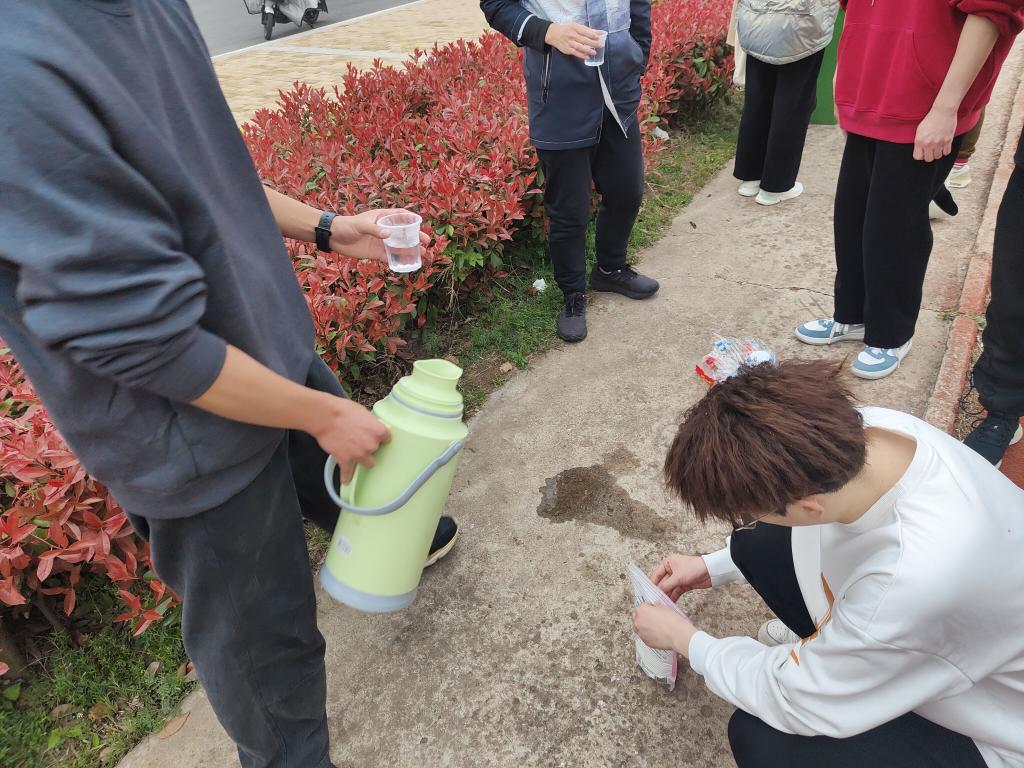 现在正值春寒料峭,微寒的空气吸入体内会有很多不适。为保护同学们的身体健康,避免感冒,该班申请缓测的同学主动在终点处为同学们倒好热水,搀扶体力透支的同学并为他们递上衣物。一个小小的举动,或许微不足道,但是却温暖了彼此,凝聚了班集体。