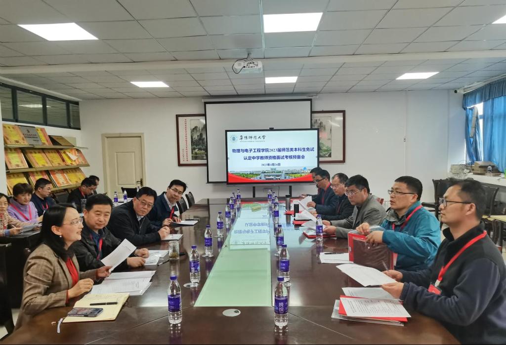 物理与电子工程学院高度重视此次教师资格面试考核工作,成立了面试考核工作领导小组,并依据学校《关于开展2023届师范类本科生免试认定中小学教师资格考核认定工作的通知》 《关于2023届师范类本科生免试认定中小学教师资格教学能力面试考核的通知》 文件要求,结合我院实际制定了详细的考核方案。学院还邀请了阜阳市三中于洪刚、张士伟、阜阳市十九中周锋、阜阳市二中周宣兴、阜阳市红旗中学李铁马、阜阳师范大学附属中学王正等六位基础教育专家分别担任各组考核组长。会上,各位领导和老师对物电学院本次面试考核展开了细致的讨论,并举行了校外教育实践导师聘任仪式。