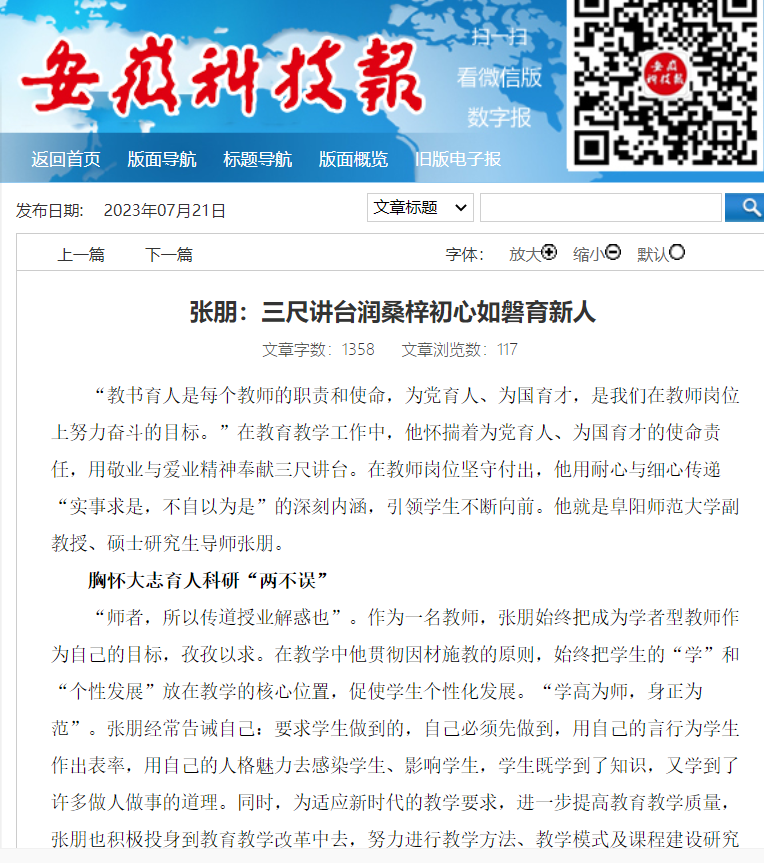7月21日,安徽科技报报道:张朋:三尺讲台润桑梓初心如磐育新人。文章地址:http://ahkjb.joyhua.cn/ahkjb/20230721/html/content_20230721007005.htm