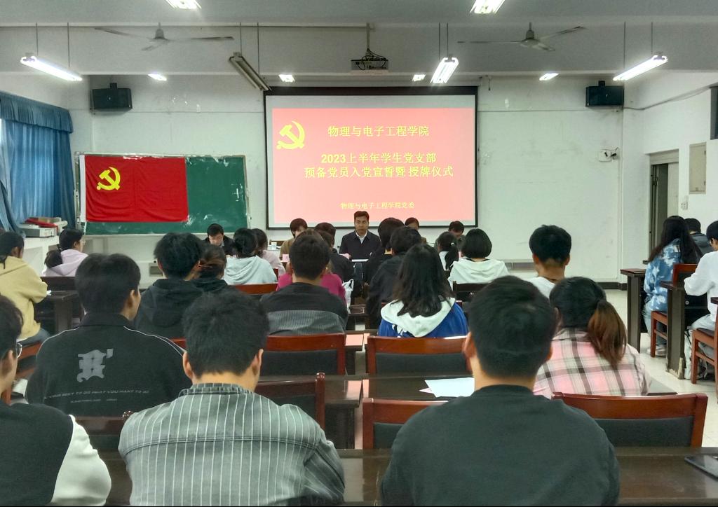 为深入学习贯彻党的二十大精神,学习贯彻习近平总书记关于党的建设的重要思想,扎实做好党员教育工作,强化党员队伍建设,9月24日,物理与电子工程学院党委在躬行C楼505教室举行了新党员入党宣誓仪式。学院党委书记吴学军出席仪式并讲话,党委组织员邵丽丽、各学生党支部书记及今年6月发展的38名新党员参加了仪式,仪式由自动化系学生党支部书记李聪主持。