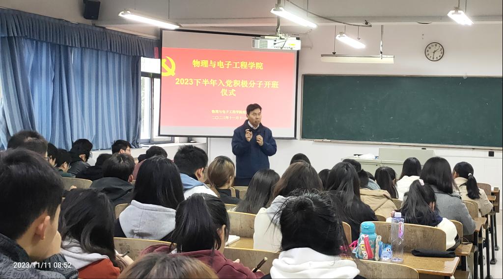为加强对入党积极分子的培训,帮助入党积极分子更好地学习掌握党的基本知识和基本理论,端正其入党动机,切实做好入党积极分子的培养教育工作,11月11日,物理与电子工程学院党委在躬行A楼203教室举行2023年下半年入党积极分子培训班开班仪式,拉开了本次培训班的帷幕。学院党委书记吴学军出席开班式并做动员讲话,学院党委组织员邵丽丽、各学生党支部党务助理以及77名入党积极分子参加了开班仪式。