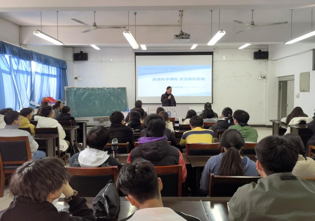 12月2日,在躬行C楼505报告厅教育部基础教育教学指导委员会科学专委会副主任、华东师范大学附属桐庐学校副校长、特级教师、正高级教师王士春为师生做了题为《深读科学课标 关注探究实践》的报告。科学教育专业本科生、学科教学(物理)教育硕士研究生,部分教师以及从阜阳幼儿师范专科学校和阜阳市区小学慕名而来的科学老师聆听了报告。报告由科学与技术教育硕士领域负责人顾江鸿主持。