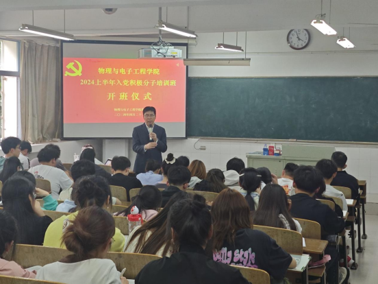 为切实做好入党积极分子的培养教育工作,提高入党积极分子的政治素养和理论修养,加强入党积极分子队伍建设, 4月21日,物理与电子工程学院党委在躬行A楼104教室举行2024年上半年入党积极分子培训班开班仪式。学院党委书记吴学军出席开班式并做动员讲话,辅导员刘少杰、各学生党支部党务助理以及本期培训的91名入党积极分子参加了开班仪式。