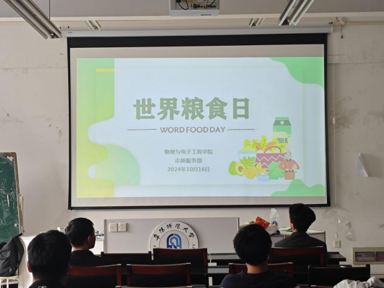 为积极响应以“粮安天下,共建更好生活,共创美好未来”为主题的第44个世界粮食日的全球活动,提高同学们对粮食安全的认识,养成节约粮食的习惯,10月16日,物理与电子工程学院在躬行C楼505组织学生代表观看粮食安全的相关影片。
