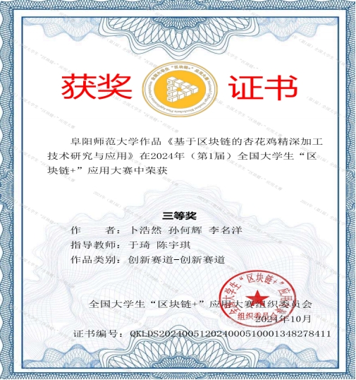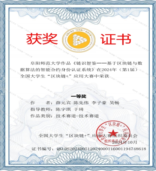 全国大学生“区块链+”应用比赛作为一项具有广泛影响力的学术赛事,为大学生创新能力的培养、创新思维的提升提供了广阔的平台,推动了大学生创新能力的发展。我院“EIG探索先锋队”在竞赛前刻苦学习、充分准备,在竞赛中沉着冷静、力克困难,在陈宇琪、于琦老师的指导下,由薛元宾、陈先伟、李子豪、吴畅同学组成的参赛队伍,经过激烈的角逐,在技术赛道中荣获国家一等奖;由卜浩然、孙何辉、李名洋同学组成的参赛队伍,在创新赛道中荣获国家三等奖。本次比赛中,参赛的同学充分发挥了专业优势,展现了卓越的创新能力,彰显了扎实的学术功底。