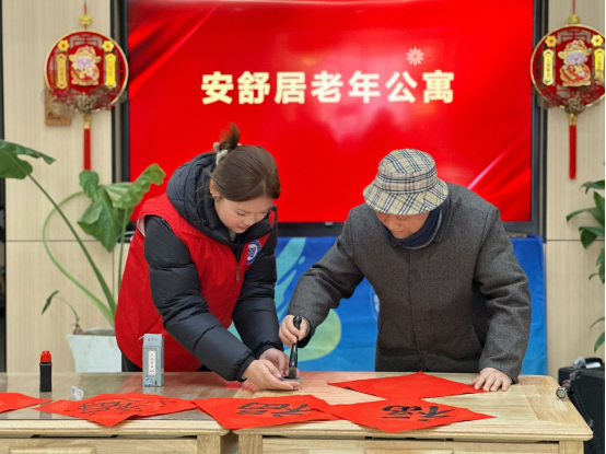 活动伊始,志愿者们早早地来到了敬老院,他们身着统一的志愿者服装,脸上洋溢着青春的笑容,为即将展开的活动注入了无限活力。志愿者们准备丰富多样的表演节目,如激情四溢的歌唱《最炫民族风》、悠扬动听的笛子演奏《大鱼》、温馨感人的吉他弹唱《晴天》以及轻盈灵动的舞蹈《酒醉的蝴蝶》等,充分展现了新时代大学生的青春活力。在翰墨挥毫环节,志愿者们用心用情用力书写“福”字,将满满的祝福与敬意献给老人们。老人们被这份深情所触动,兴之所至,他们提笔亲自书写属于自己的“福”字,与志愿者们交换传递幸福与美好的祝愿。