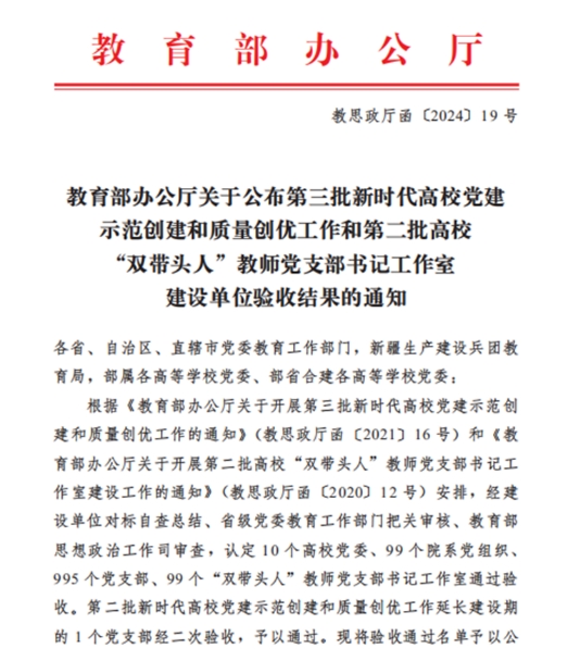 近日,教育部发文公布了第三批新时代高校党建示范创建和质量创优工作建设单位验收通过名单,我院物理系教师党支部顺利通过“全国党建工作样板支部”培育创建结项验收,正式成为“全国党建工作样板支部”。
