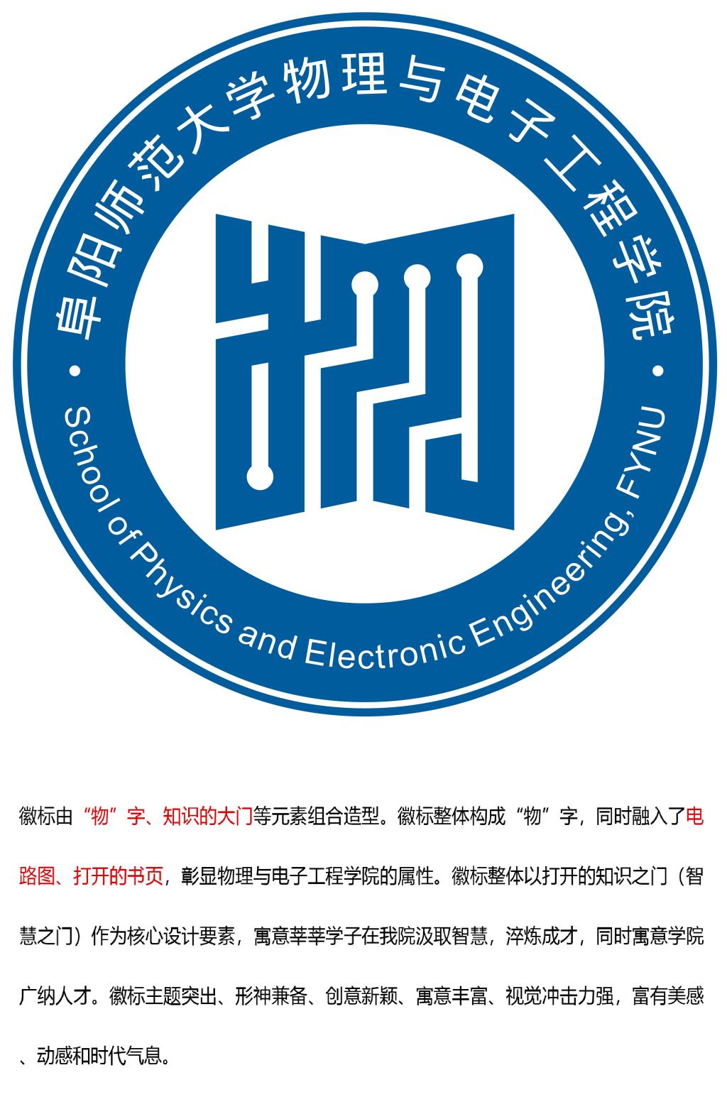 阜阳师范大学物理与电子工程学院标识(院徽)在公开征集的基础上,经专家评审和师生投票,确定入围作品,又经原设计方进行修改完善,现正式确定,见附件。自即日起启用。