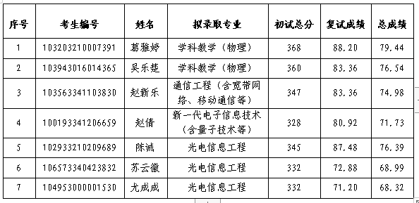根据教育部《关于印发<2023年全国硕士研究生招生工作管理规定>的通知》(教学〔2022〕3号)、《关于做好2023年全国硕士研究生复试录取工作的通知》(教学司〔2023〕3号)和安徽省高等学校招生委员会 安徽省教育厅《关于做好安徽省2023年硕士研究生复试录取工作的通知》(皖招委〔2023〕4号)等文件精神,按照安徽省2023年硕士研究生招生录取工作会议要求、阜阳师范大学物理与电子工程学院学院2023年硕士研究生复试录取工作方案。现将我院2023年学科教学(物理)、电子信息专业全日制硕士研究生调剂考生(第1次)拟录取名单公示如下: