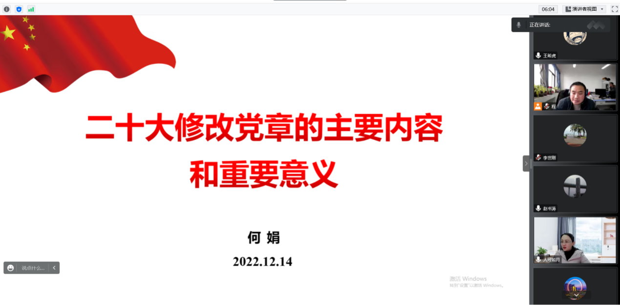为进一步学习党的二十大精神,提升支部党员的政治理论素养,12月14日,物理系教师党支部开展了“支部书记上党课”活动,何娟同志作为主讲人,党课主题为“二十大修改党章的主要内容和重要意义”,活动在腾讯会议线上举行。