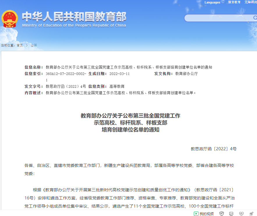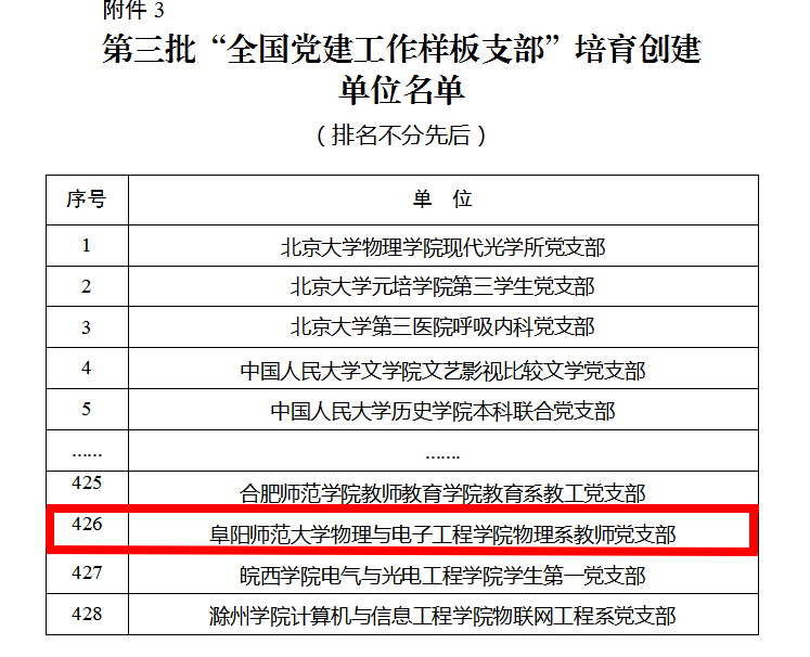 近日,教育部办公厅发文公布了第三批全国党建工作示范高校、标杆院系、样板支部培育创建单位名单,我院物理系教师党支部入选“样板党支部”培育创建单位。