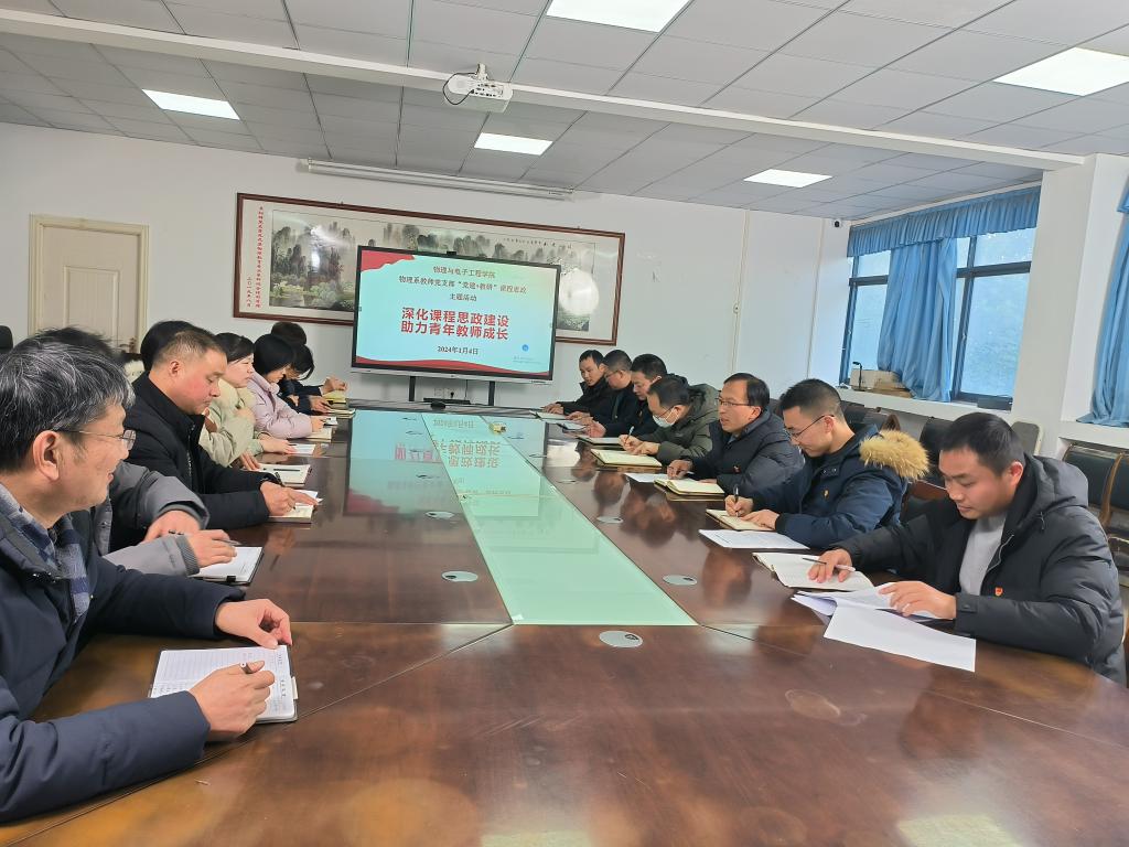 2024年1月4日,物理系教师党支部组织开展了“深化课程思政建设,助力青年教师成长”为主题的“党建+教研”活动,支部全体党员参与了此次活动,活动由物理系教师党支部副书记张朋主持。