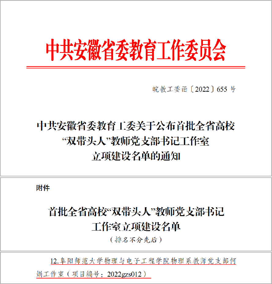近日,中共安徽省委教育工委印发了《关于公布首批全省高校“双带头人”教师党支部书记工作室立项建设名单的通知》,首批共遴选建设30个全省“双带头人”教师党支部书记工作室,我院物理系教师党支部何娟工作室获批立项。