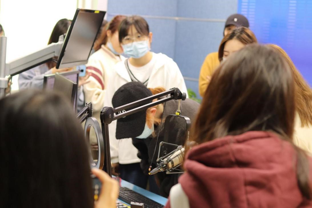 接着,阜阳新闻广播电台另一位前辈带领我们走进了阜阳电视台广播的直播室,看到了正在认真工作的主持人,等到主持人休息间隙时,我们的同学积极上前,踊跃的向主持人提问一些关于她们日常工作的的相关问题,主持人前辈也耐心细致的为我们的同学们答疑解惑,平易近人的她们所传授的相关经验让我们的同学们进一步感受到新闻工作的意义,让我们同学对于新闻行业再次增添几分热情。