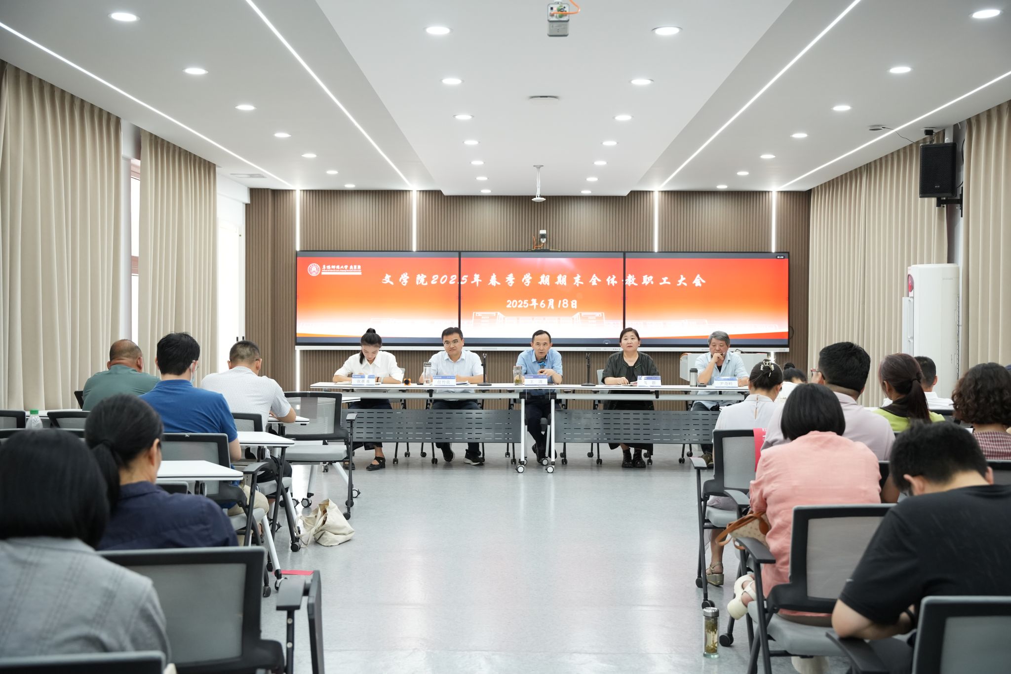6月18日下午,文学院在西湖校区三区B楼102室召开2025年春季学期期末全体教职工大会。学院领导班子成员及全体教职工参加会议。会议由学院党委副书记任竹良主持。