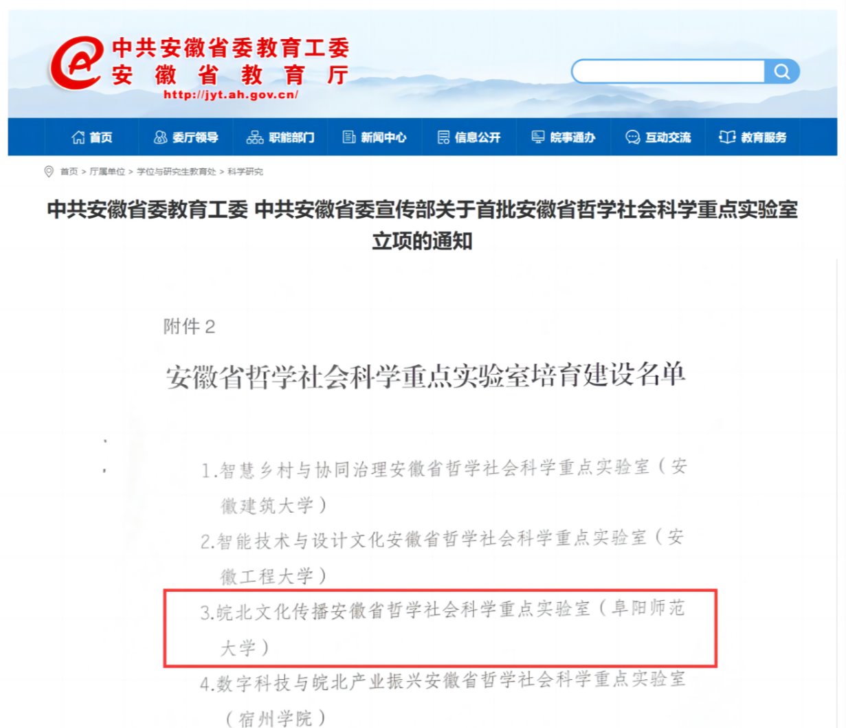 省委教育工委和省委宣传部公布了首批安徽省哲学社会科学重点实验室立项名单,学校申报的“皖北文化传播安徽省哲学社会科学重点实验室”成功入选首批重点实验室培育建设。