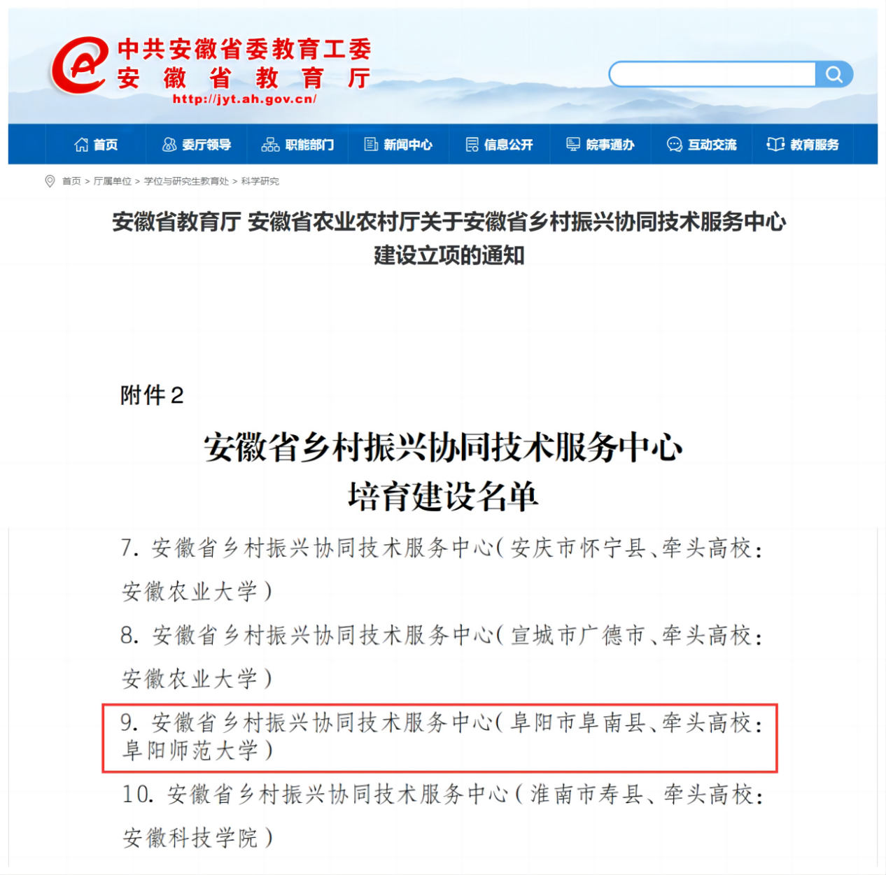省教育厅和省农业农村厅公布了乡村振兴协同技术服务中心建设立项名单,由学校和阜阳市阜南县牵头申报的“安徽省乡村振兴协同技术服务中心”入选。