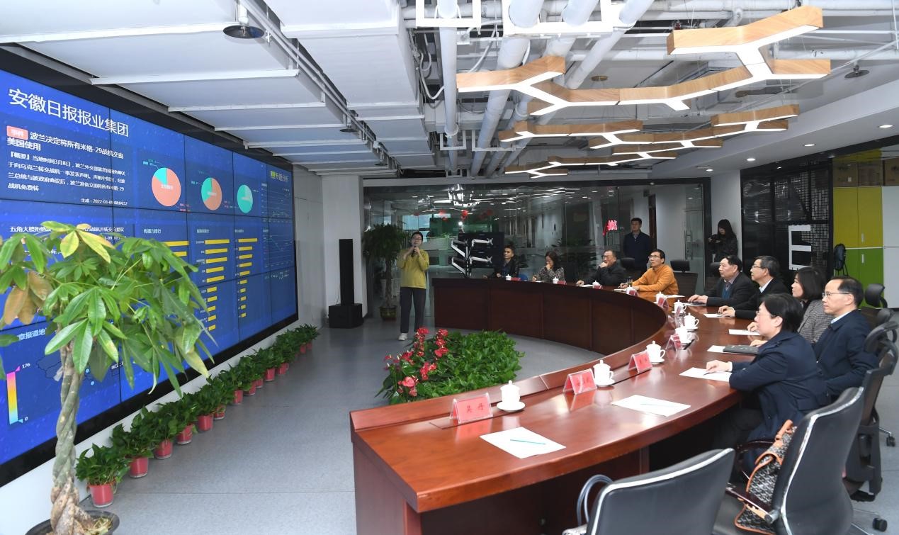 《安徽日报》是省委机关报,是安徽最具影响力的主流媒体。调研团队一行来到安徽日报报业集团,参观了安徽日报新媒体中心平台和演播室,详细了解安徽日报报业集团融媒体建设、全媒体采访、大数据运维、内容提升和精品打造等方面情况,就阜阳师范大学融媒体实验中心建设等相关问题进行深入交流。