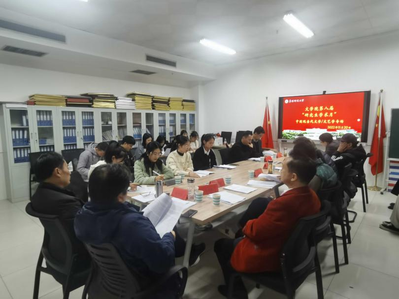 2022年11月20日晚7点,文学院第八届“研究生学术月”之现当代文学、文艺学专场报告会在景行楼826会议室举行。此次报告会邀请文学院现当代方向尹奇岭、张晓东、毕新伟、任竹良、金星、吴景祥老师,文艺学方向郭世轩、王明科、李鹏飞老师担任评议人,2021级和2022级现当代文学、文艺学及部分学科语文研究生参与了报告会。